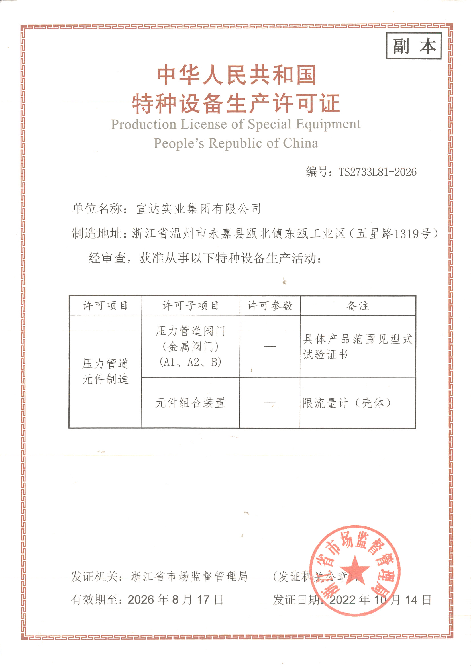 - 特种设备制造许可证 颁发单位 浙江省科学技术厅/财政厅/国家税务局总局浙江省税务局